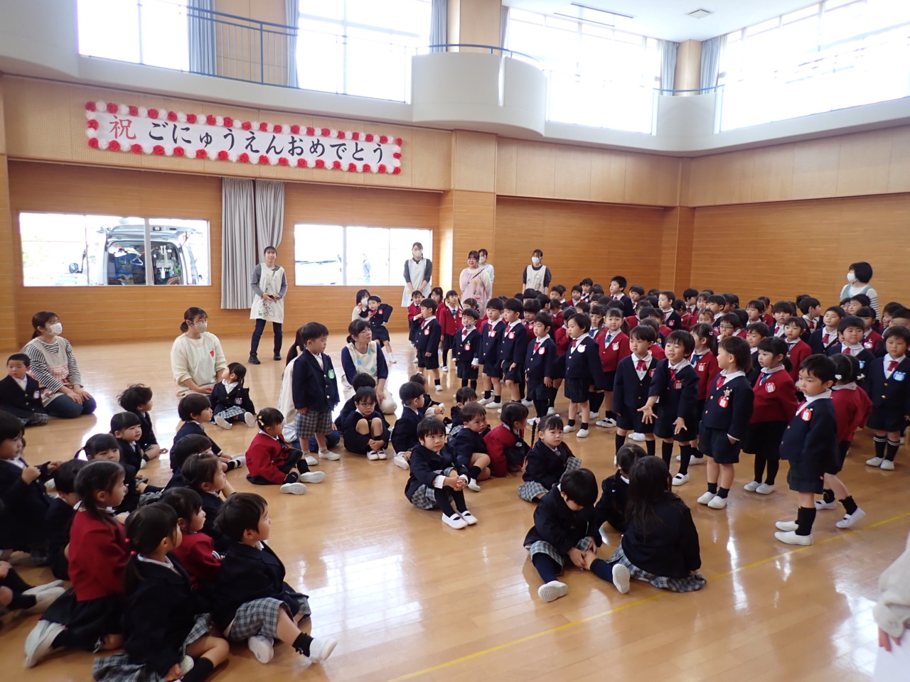 13日(月)入園した「おひさまっこ」のお友だちと一緒に全員揃って「第1学期始業式」と「はじめまして よろしく」の会を行いました。