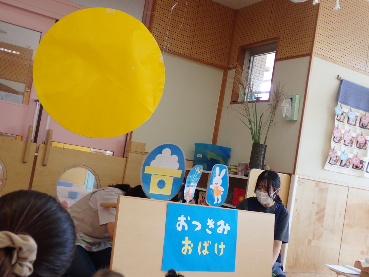 乳児部をのぞきますと、『お月見の会』が開かれていました。「お月見」のお話やペープサートで「おつきみおばけ」の読み聞かせがあったり、「つき」の歌をみんなで歌ったりと、楽しい「お月見会」となりました。