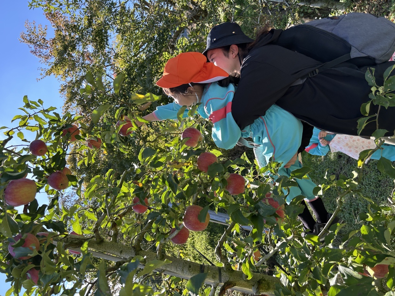 年長組の子どもたちは、りんごの取り方を教えてもらい、自分で好きなりんごを選んで取りました。大きいりんご、真っ赤なりんご、形が綺麗なりんご。子どもたちそれぞれ思いも思いのりんごを選んでいました。